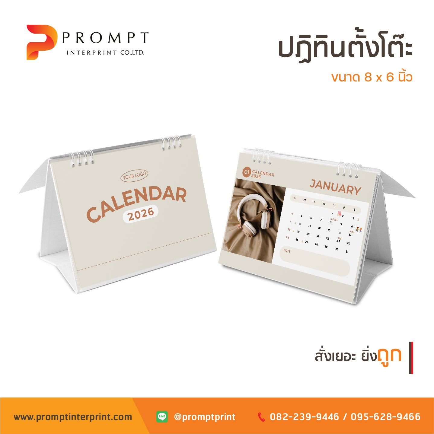 ปฏิทินตั้งโต๊ะโทนอบอุ่น สไตล์โมเดิร์น โทนสีครีม–น้ำตาล เรียบง่ายแต่ดูดี เหมาะกับทุกโต๊ะ ไม่ว่าจะโต๊ะทำงาน มุมอ่านหนังสือ หรือวางไว้ที่บ้านก็ดูเข้ากัน ใช้จดบันทึก นัดหมาย หรือวางแผนงานได้ครบถ้วนตลอดปี 2026 นอกจากจะใช้งานจริงได้ทุกวัน ยังช่วยตกแต่งบรรยากาศให้ดูสบายตาและมีสไตล์มากขึ้น สามารถใส่โลโก้แบรนด์ลงไปได้ เหมาะกับการทำเป็นของขวัญปีใหม่ ของฝาก หรือของที่ระลึกสำหรับลูกค้าและคนใกล้ตัว ยิ่งสั่งเยอะก็ยิ่งคุ้ม ได้ทั้งประโยชน์และความสวยงามในชิ้นเดียว